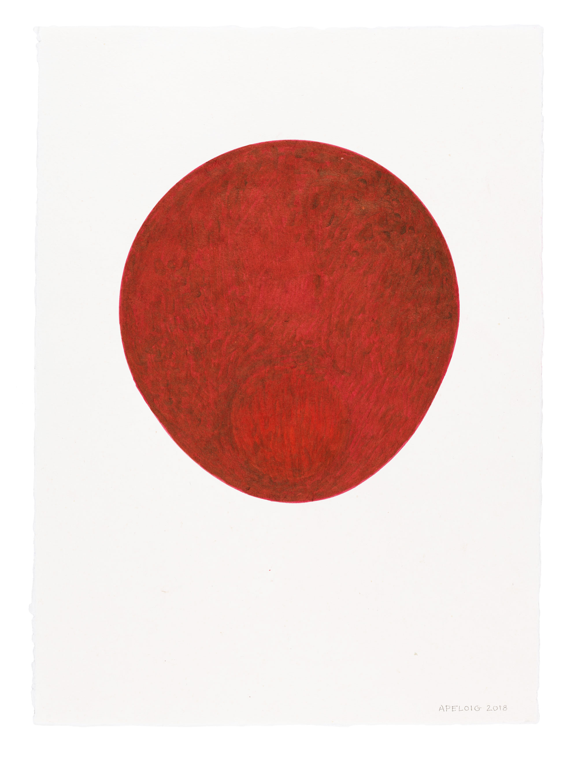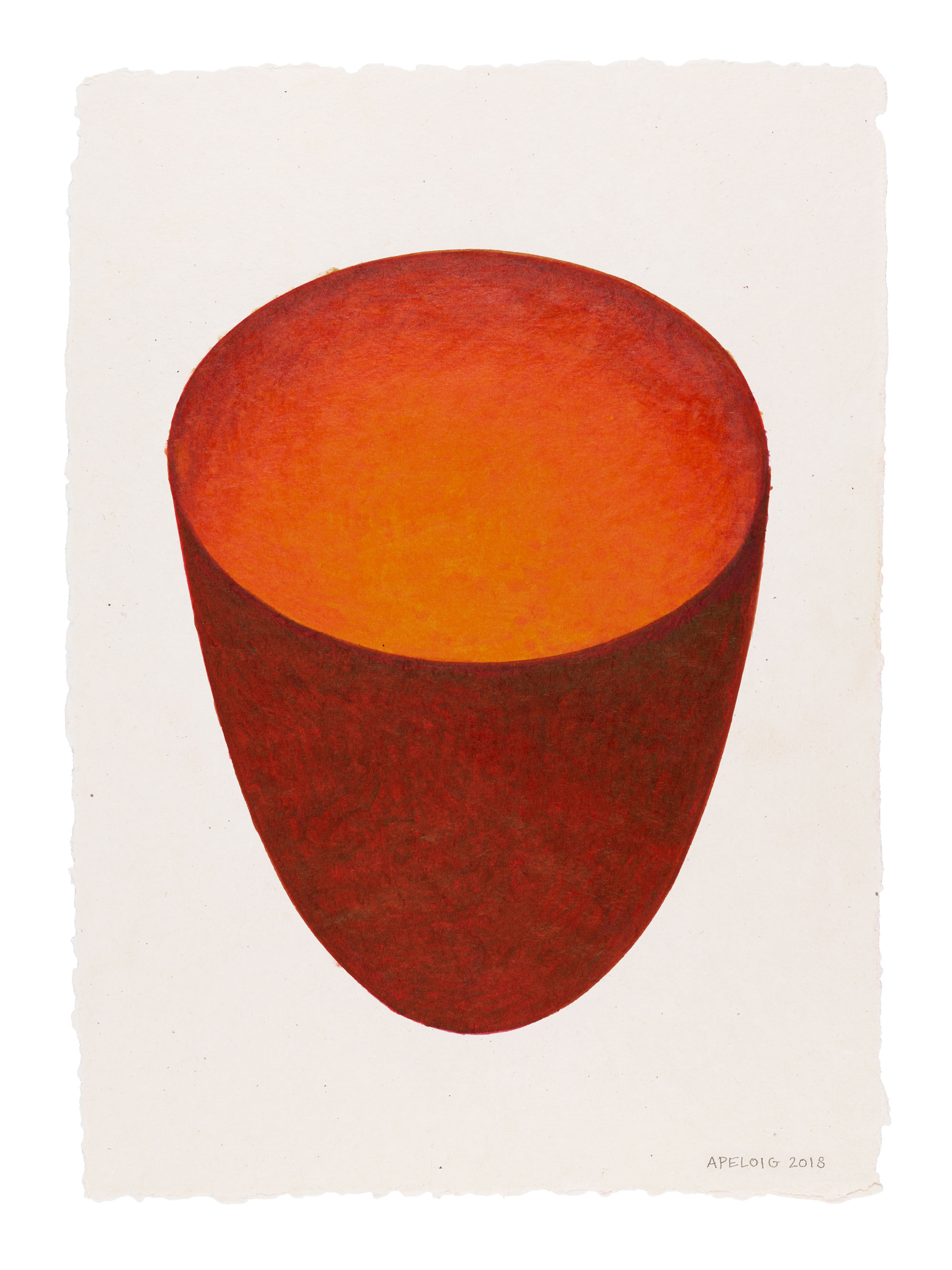Les couleurs sont denses, au point que certaines fibres du papier imbibé de pigments ont été arrachées par les multiples passages du pinceau. L’objet est vu de face dans son évasement profilé, de dessus en un cercle parfait, parfois par dessous ou via un détail si rapproché que la matière de l’objet est un dégradé qui envahit l’espace entier de la page. Le dessin de la coupe se détache sur le fond blanc du papier, dont la texture granuleuse invite au toucher. Autrement, il n’en reste que le contour, qui disparaît presque et se fond dans des aplats.