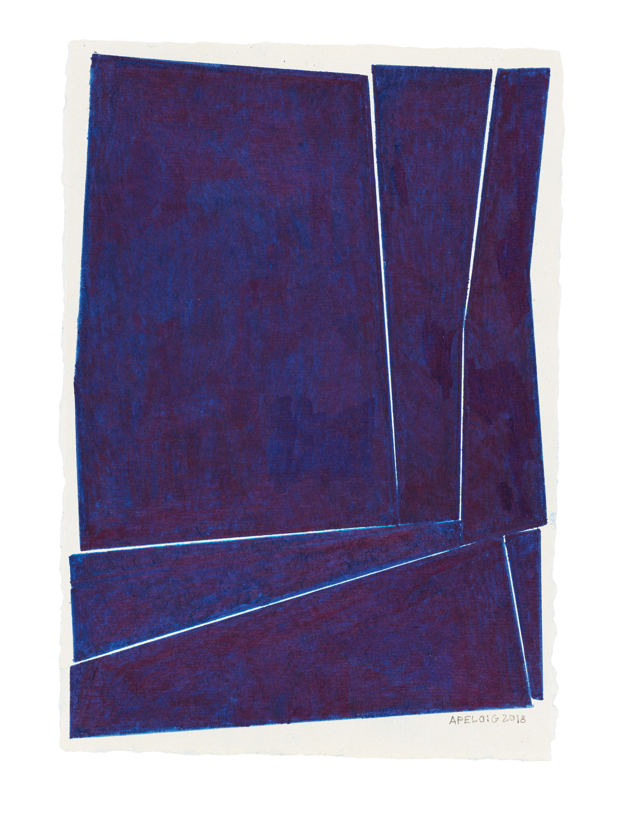D’autre part, il y a une série d’aquarelles monochromes où émergent des lignes, des motifs, parfois des lettres. Tous sont issus d’incisions comme taillées au scalpel dans des aplats bleus aux subtiles nuances : indigo, de Prusse, céruléum, de Phtalo. Ces fentes laissent entrevoir le blanc du papier, et dessinent des lettres en négatif : c’est la réserve qui devient lumière.